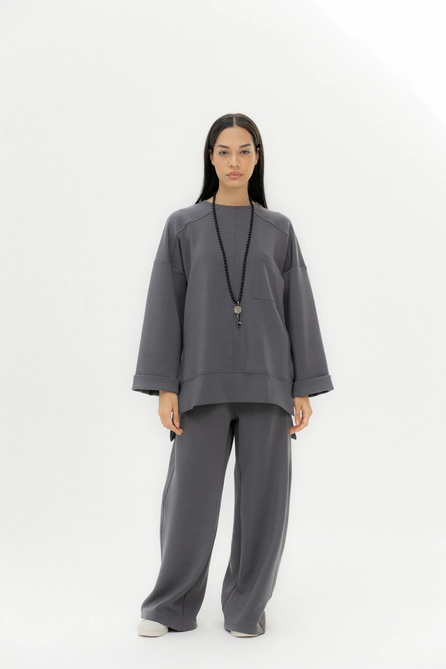 • Flowy high-low long top paired with wide-leg pants for a sleek, effortless silhouette.
