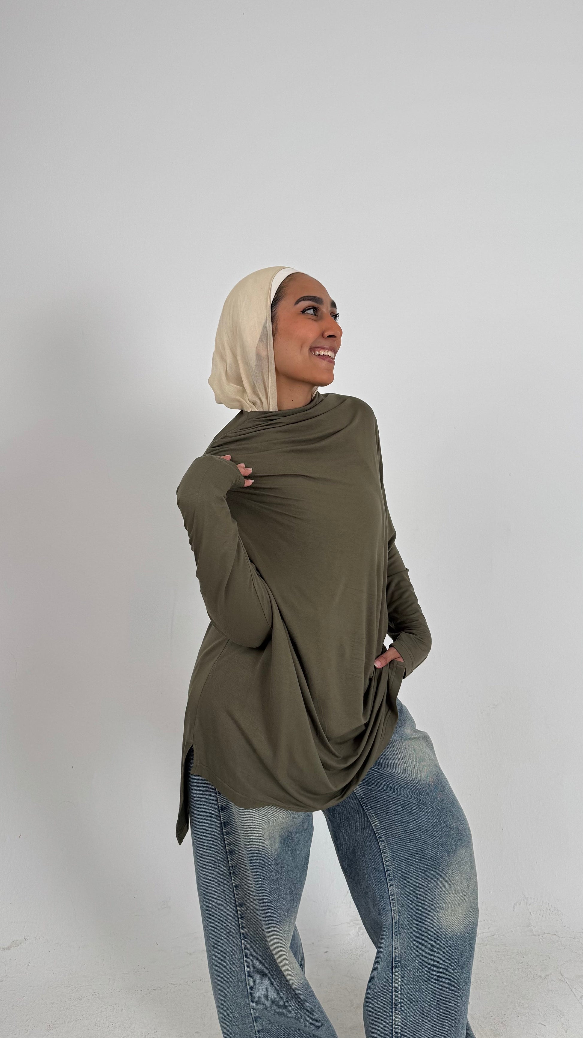Soft top in cotton lycra with a high neckline, long sleeves, and a gently draped effect down the front.