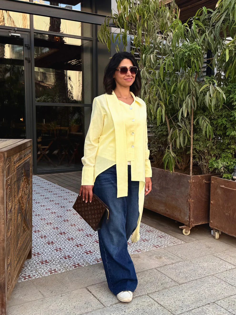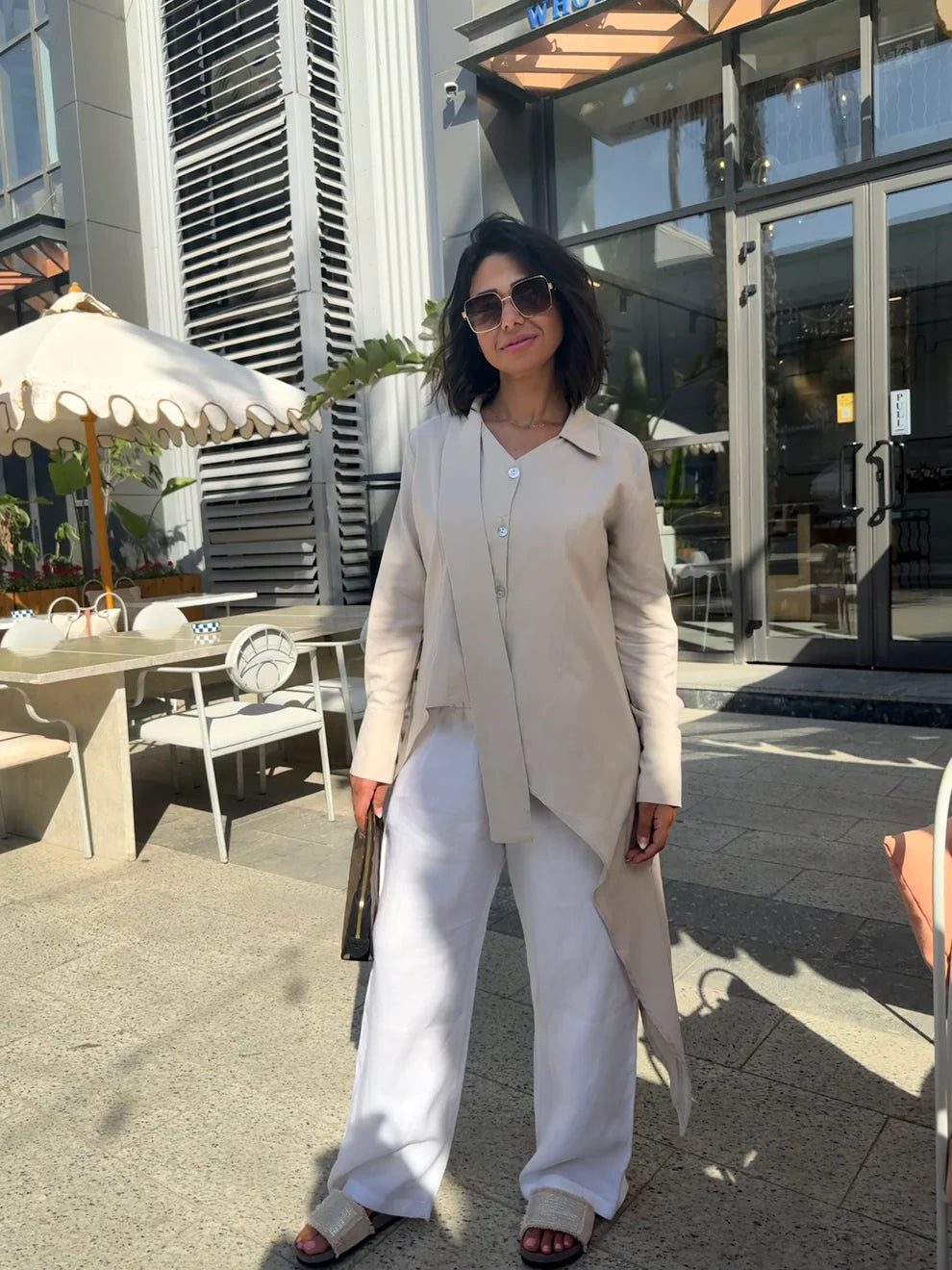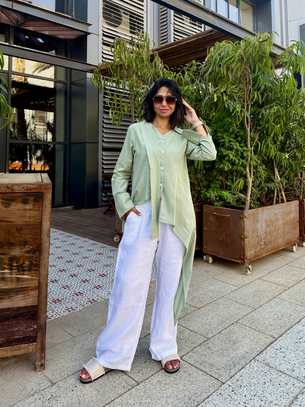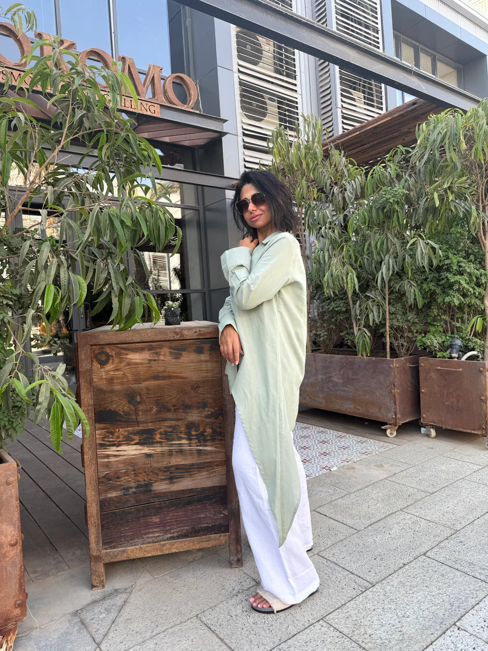 The shirt in the image is a light sage green asymmetrical kurta-style top made from a lightweight, breathable fabric linen. adding a contemporary, flowy silhouette. The relaxed fit and natural fabric make it perfect for casual or semi-formal wear.