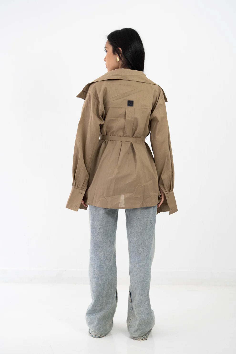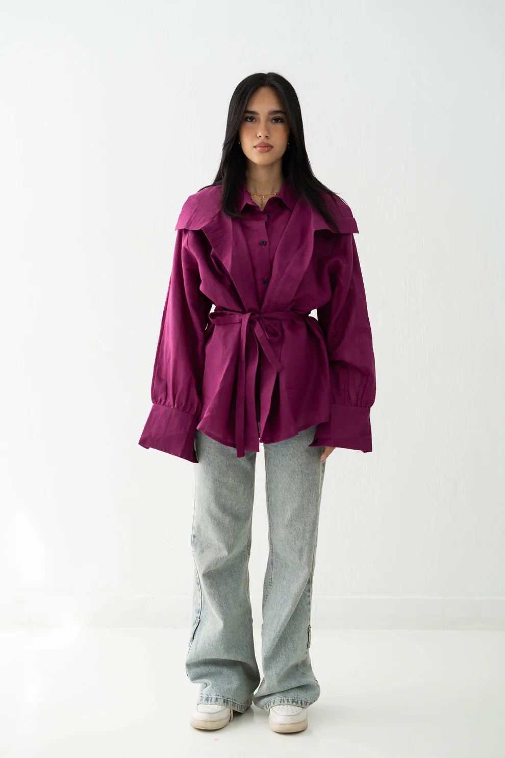 A refined blouse crafted from premium linen for a breathable, lightweight feel and effortless elegance. Designed with a distinct double collar, voluminous sleeves, and a waist tie belt that creates a flattering, cinched silhouette. Perfect for elevating everyday looks when styled with denim or tailored pieces.