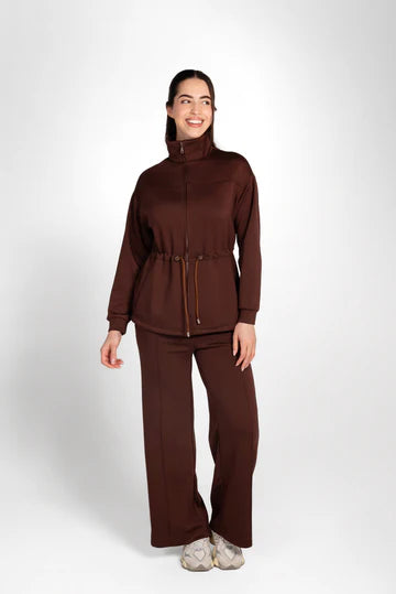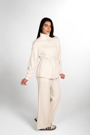 A relaxed yet flattering set made from ultra-soft fabric that feels smooth and luxurious on the skin. Designed with comfort and movement in mind, it features a high-neck zip-up top with adjustable drawstrings at the waist to shape the body beautifully while keeping a laid-back silhouette. The matching wide-leg pants complete the look — effortless, comfy, and timeless. Perfect for everyday wear, lounging, or travel days when you still want to look put-together.