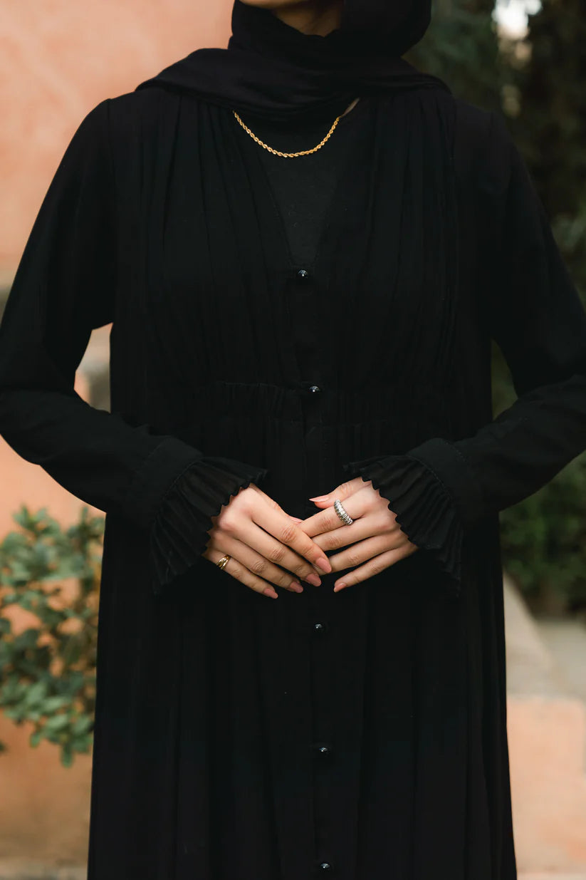 A classic black abaya with delicate pleated details, designed for timeless sophistication. The button-down front and cinched waist create a flattering silhouette, while the pleated cuffs add a subtle touch of elegance. Made from chiffon and crepe fabric, this abaya offers comfort without compromising on style.