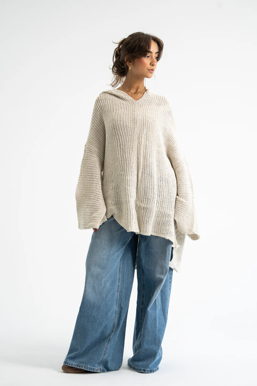 The Loom Pullover is crafted for effortless elegance and everyday comfort. Made from soft open-knit fabric, it features a relaxed oversized silhouette with dropped shoulders and flowy sleeves that drape naturally. Its light beige hue adds a timeless touch, making it perfect for layering or wearing solo. A versatile piece that blends coziness with modern minimalism.