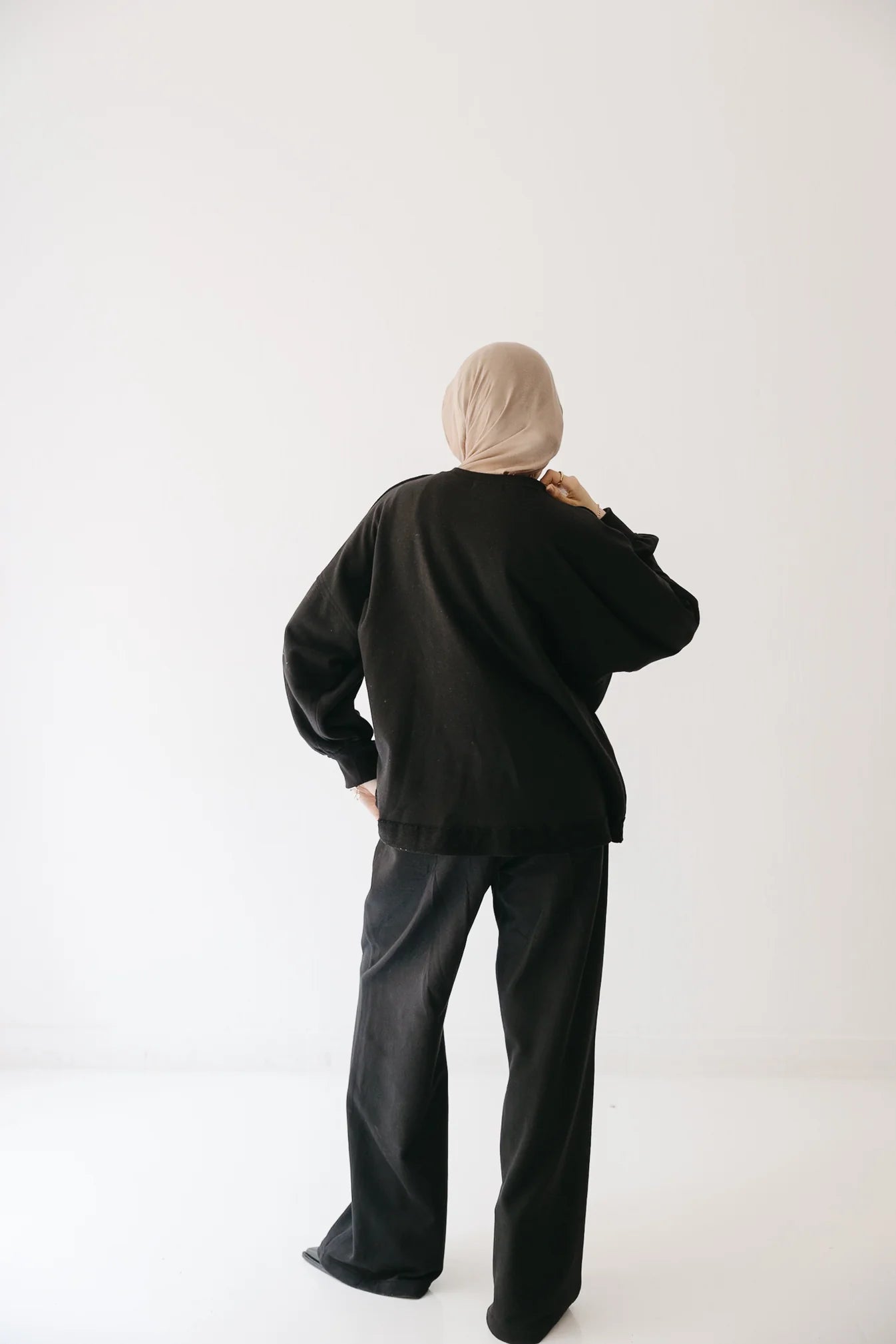 An elevated take on everyday comfort — crafted from soft black Milton fabric and adorned with delicate white floral embroidery. The oversized top paired with wide-leg pants creates a relaxed yet refined silhouette, making it the perfect blend of effortless style and timeless elegance.