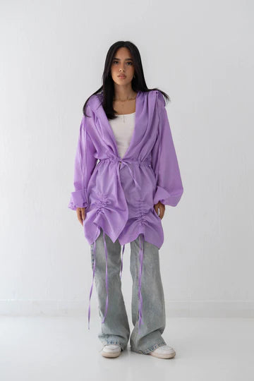A bold yet feminine layer — this maroon drawstring jacket features adjustable ties, a relaxed fit, and a soft sheen fabric. Perfect for effortless styling all year round.