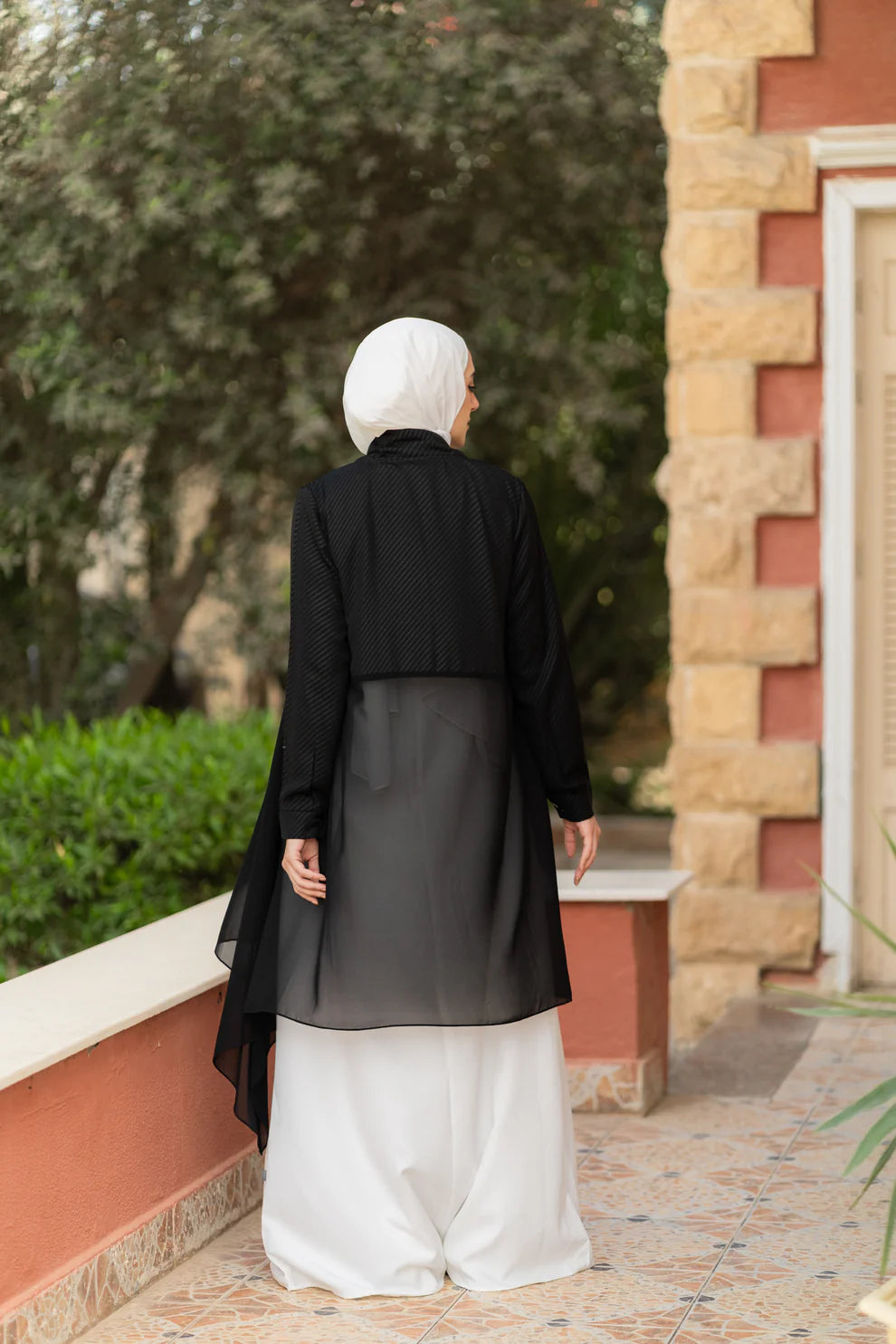 This stunning cardigan features a unique asymmetric design, crafted from luxurious silk and airy chiffon. Whether you're dressing up for a special occasion or looking for a chic layer to complete your everyday look, this piece is a must-have