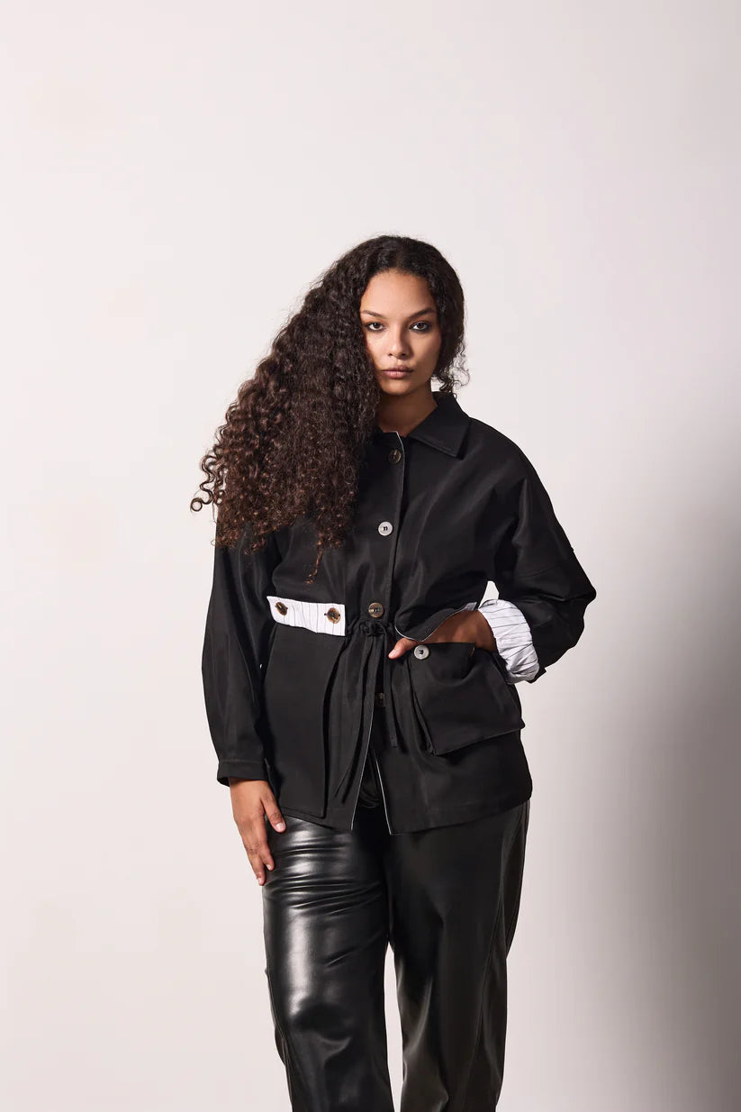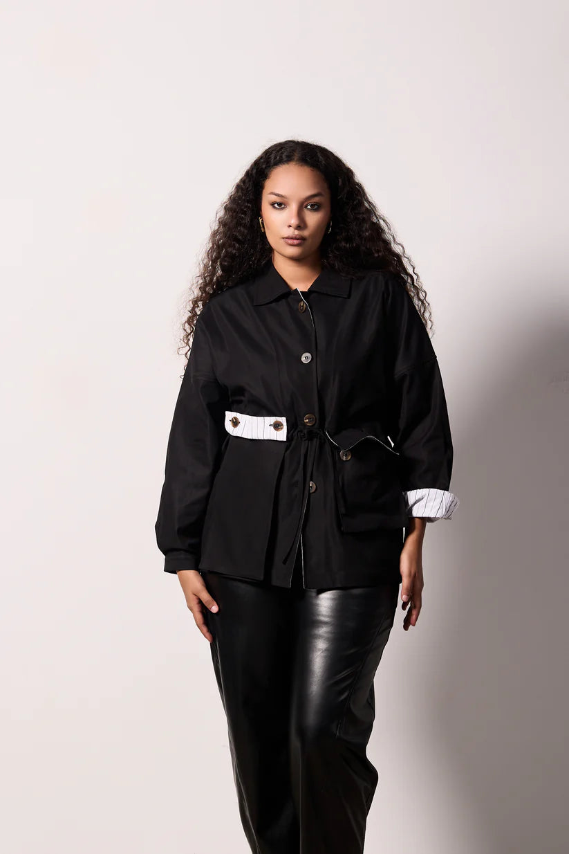 The SORA Jacket redefines effortless sophistication with its modern trench silhouette crafted from premium gabardine. This chic statement piece features signature striped lining and refined button details on the sleeves, delivering both visual interest and practical elegance. The adjustable waist ensures a flattering fit for every frame, while the short, non-cropped length offers versatile styling for any occasion. One size fits all, making it the ultimate minimal wardrobe essential that transitions seamlessly from day to night.