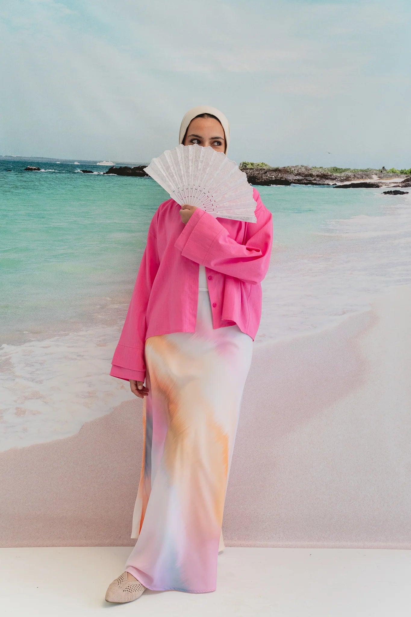 Light and airy with a flowing silhouette, this skirt features soft pastel gradients that ripple like summer seas.